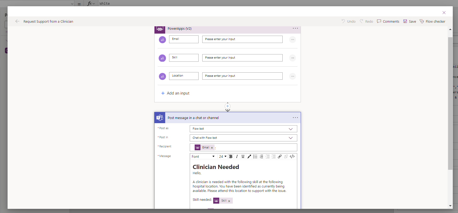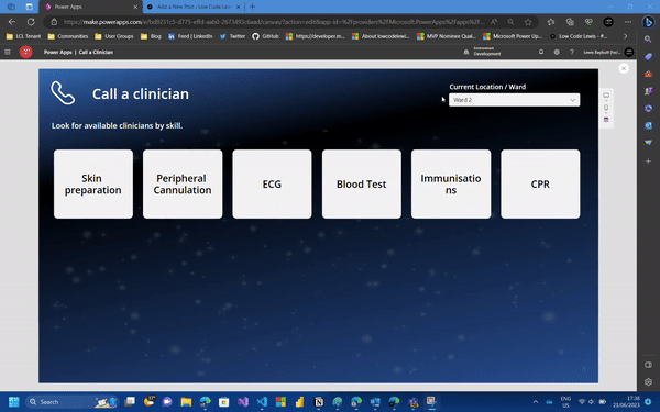 RequestSupportfromaClinician.Run(ThisItem.'Primary Email',locSkill.Name,gblCurrentLocation)Now when I select the button, it’ll send a Teams message to the clinician who I’ve clicked it against requesting their support with the relevant skill at the current location the app is set to! Check it out…