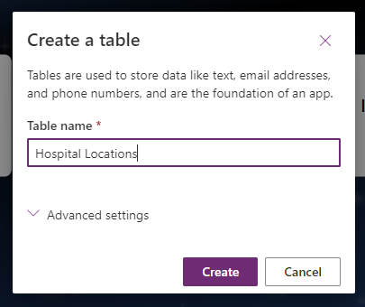 For this, I am going to create a Dataverse table of ‘Hospital Locations’ where we will simply use the name field as a list of locations we can select from when we launch the application, or on the skill selection screen in case this app is used by clinicians on a mobile basis where they will move around with the device needing other clinicians to support them in multiple locations.
