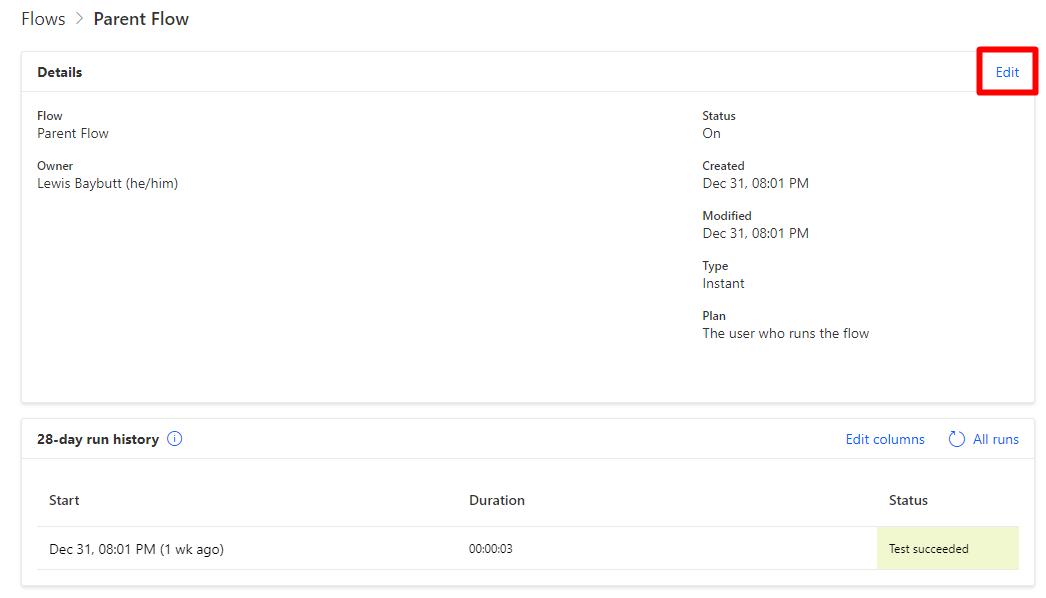 On the flow, click edit in the details box.
