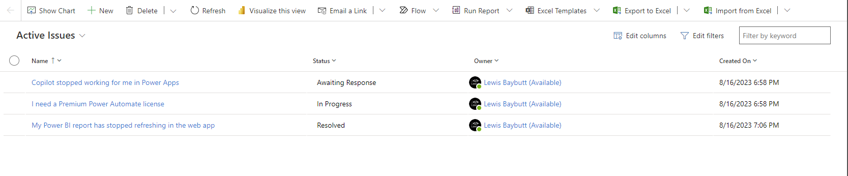 So lets look at a view I have on a table in Dynamics. Here I have a table for managing issues and a view on this table to look at all of the issues created.