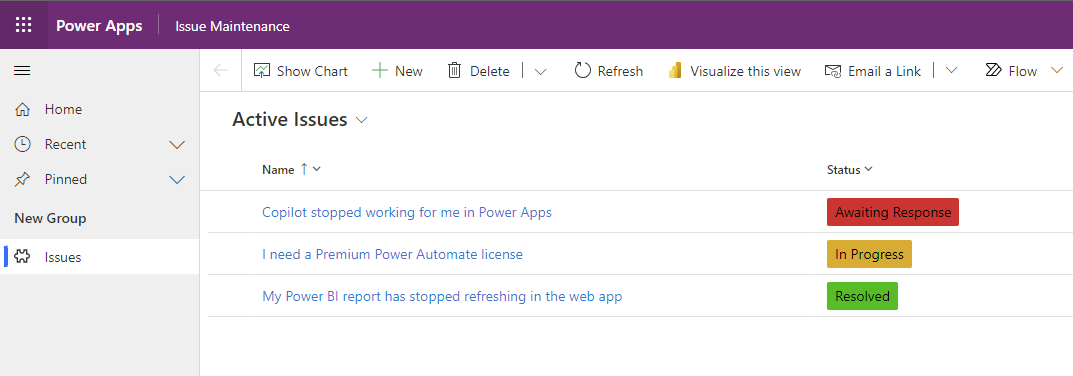 You can see I have three records here each with a different status. Now these statuses indicate different levels of urgency or priority to an extent. If something is resolved it isn’t at all urgent, so we don’t want to alarm users about that, but if something is awaiting a response, we need to make that clearer.