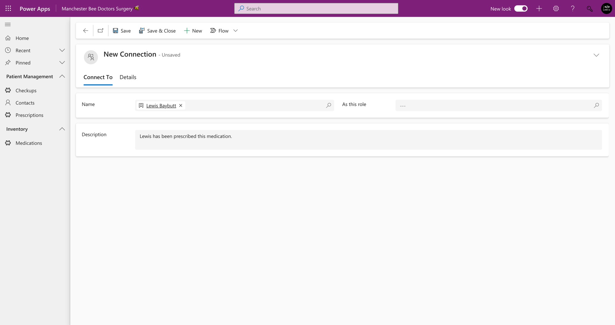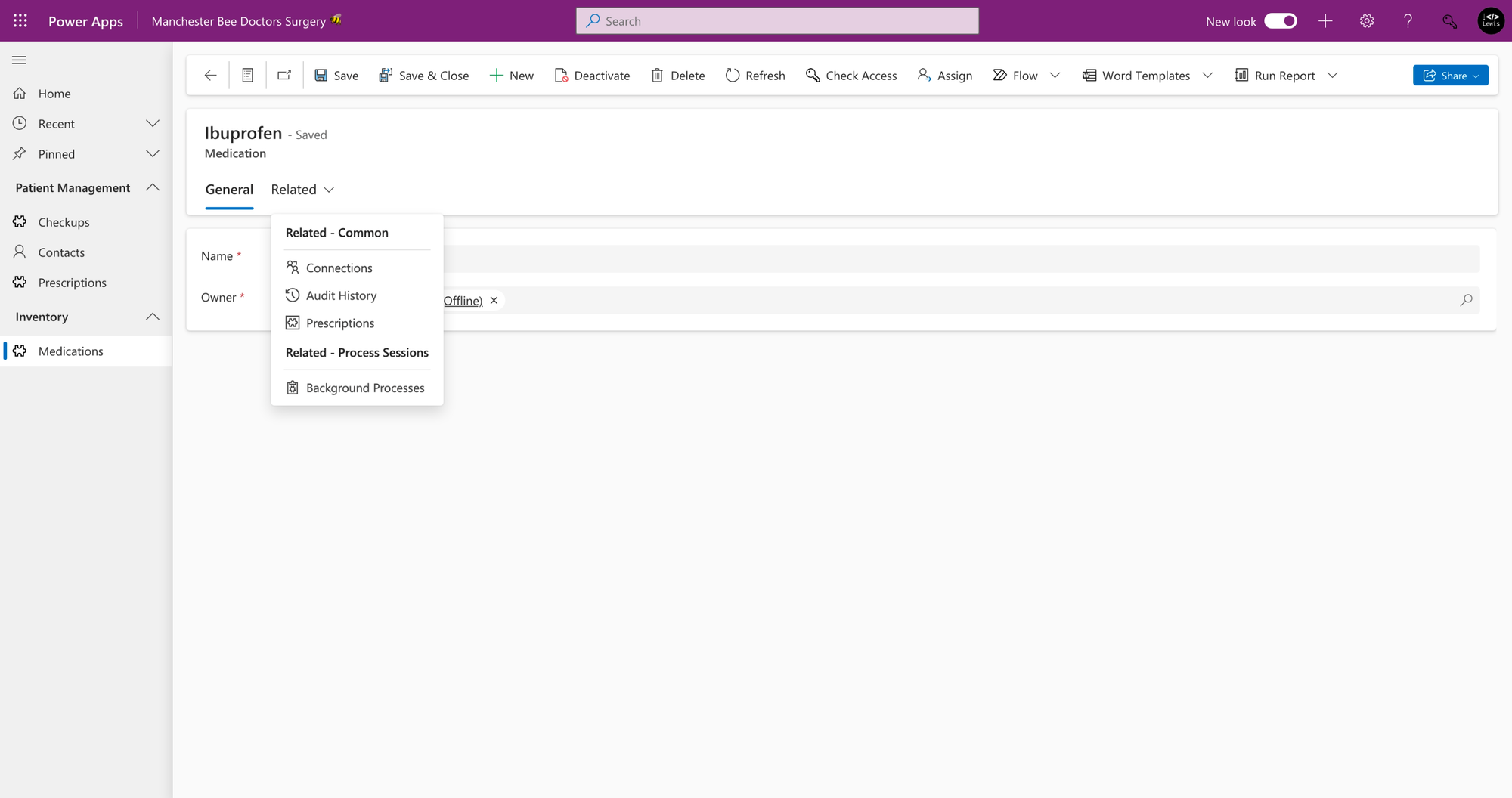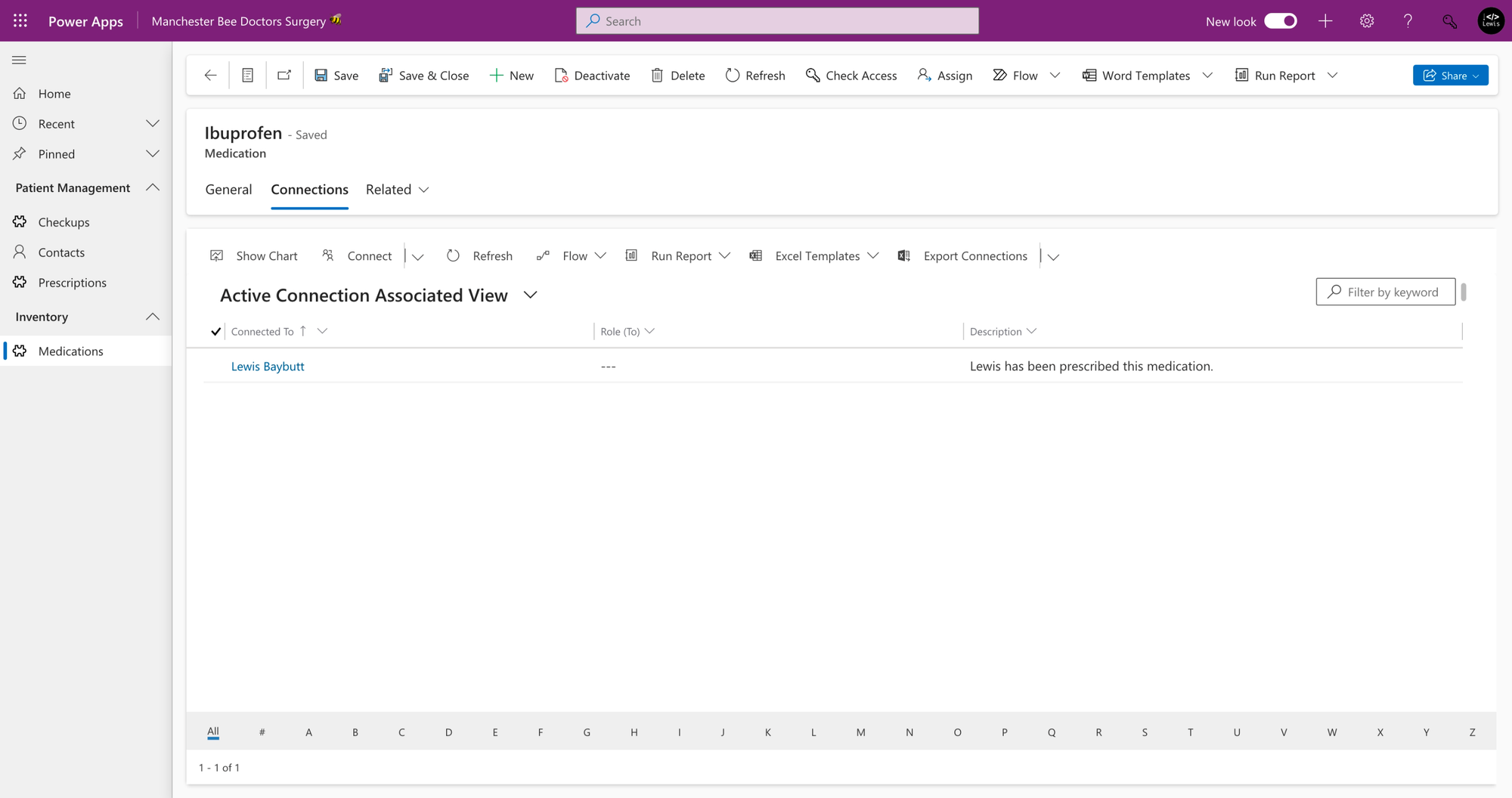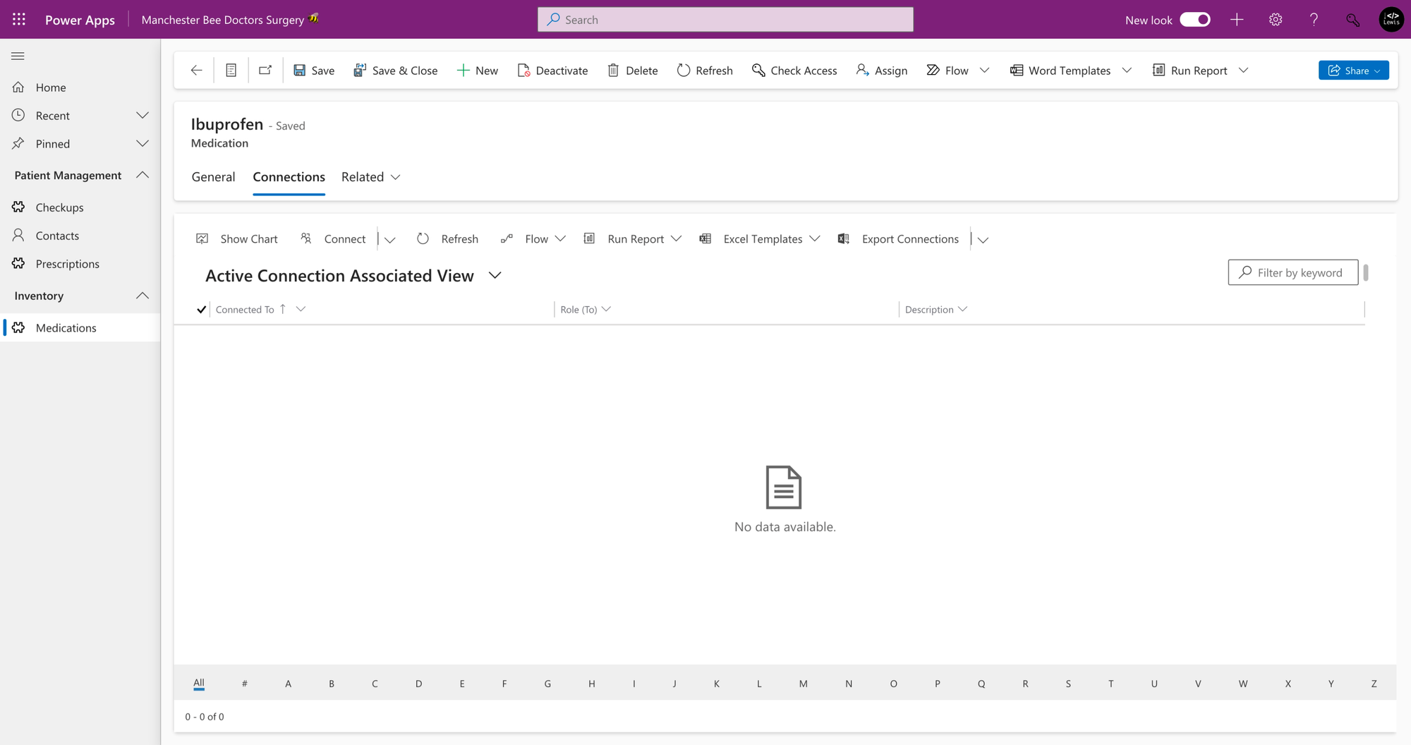 Within my model-driven app, I’ve navigated to a medication record and now when I select the related dropdown I can see ‘connections’.