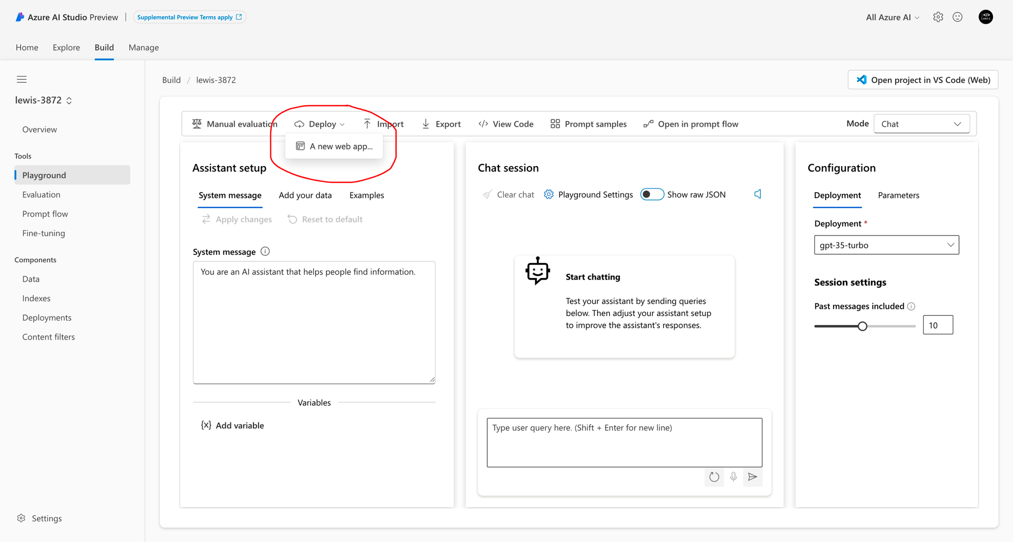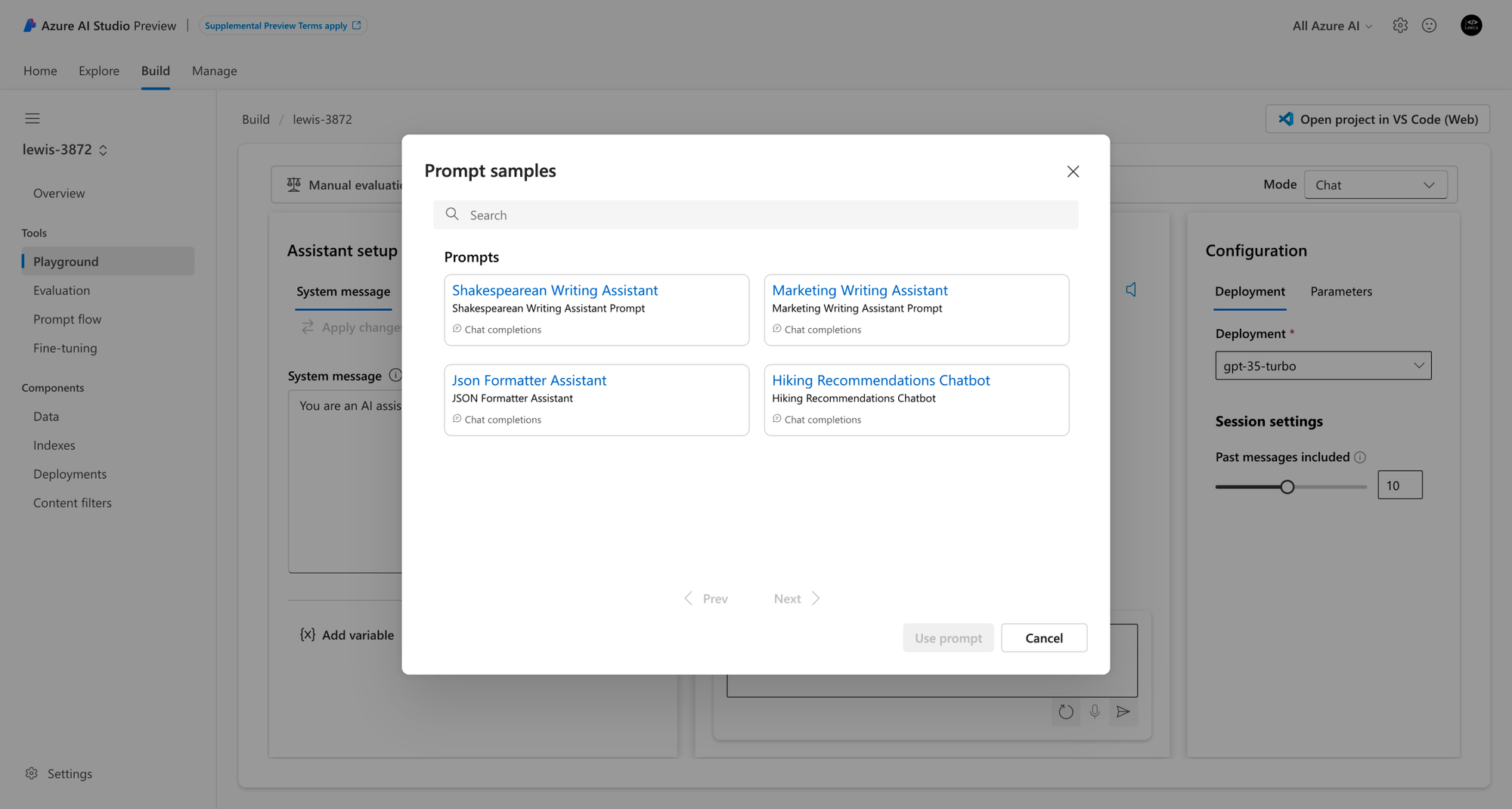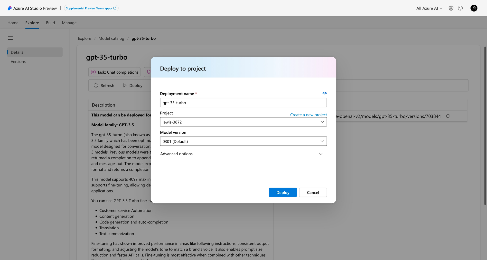 So letās jump straight into building in the Azure AI Studio. Iām going to head into the catalogue and deploy GPT 3.5 Turbo to a new project which Iāll createā¦