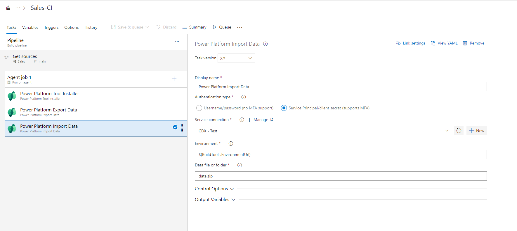 Very simply, this time I’ll select the service connection for the environment I want to import my data too, then I’ll set the Data file or folder field to the same value I had for the data file on my export step which is data.zip (by default).
