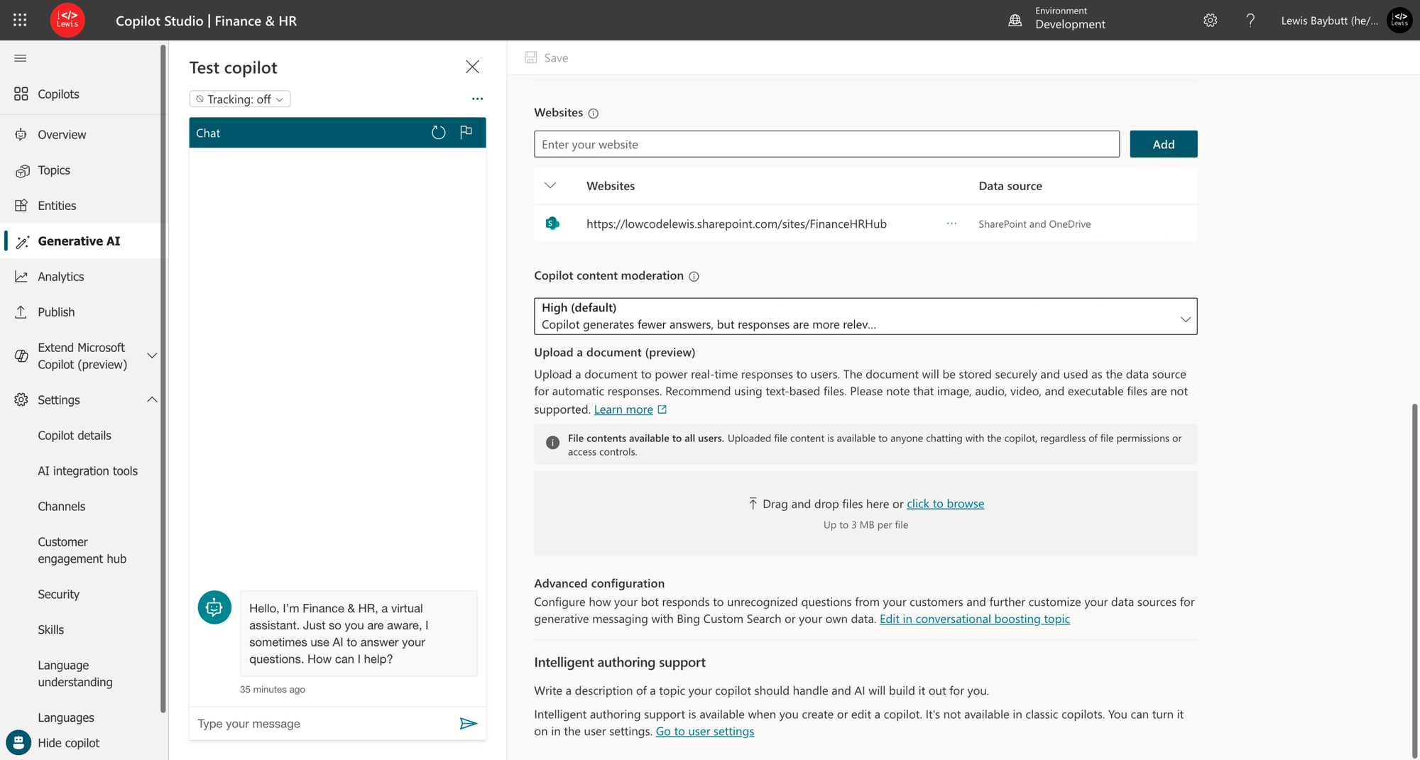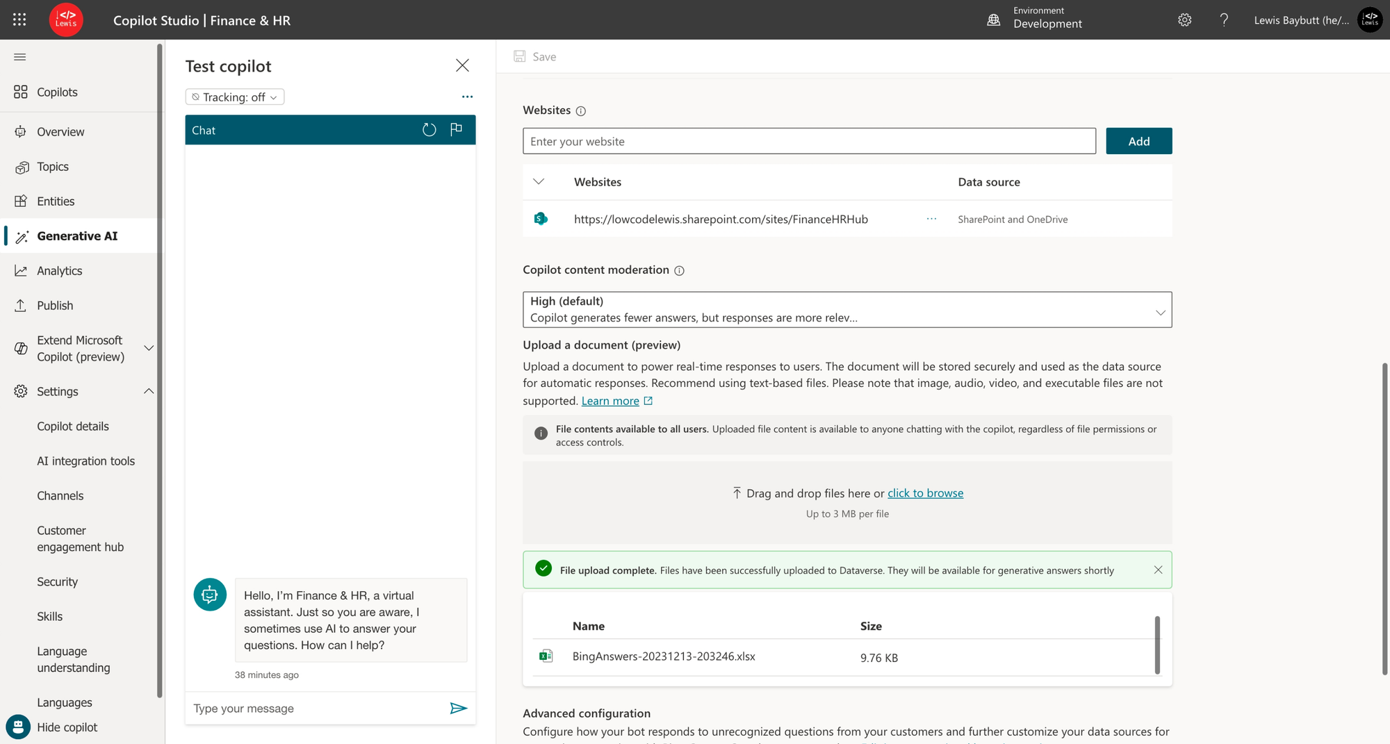 Okay so now letโs take a look at what I can do in Copilot Studio to have my copilot answer questions about my Excel data. On the generative AI tab I have an area where I can upload documents.