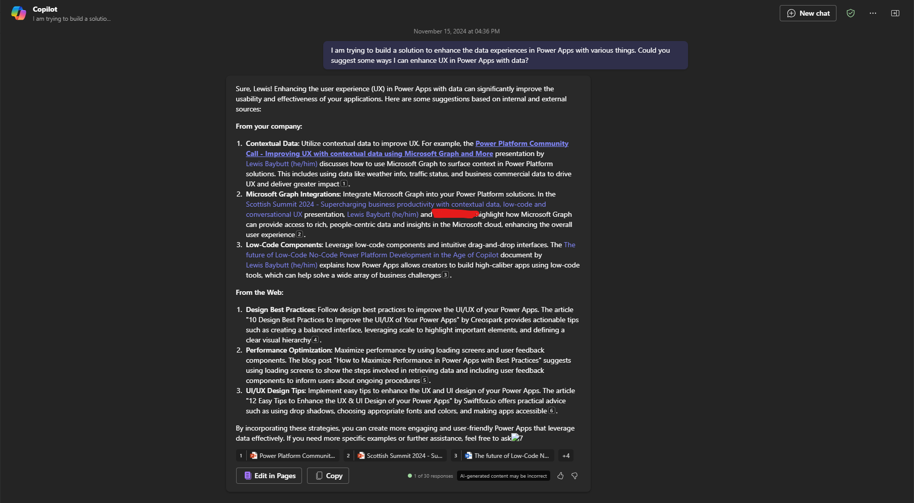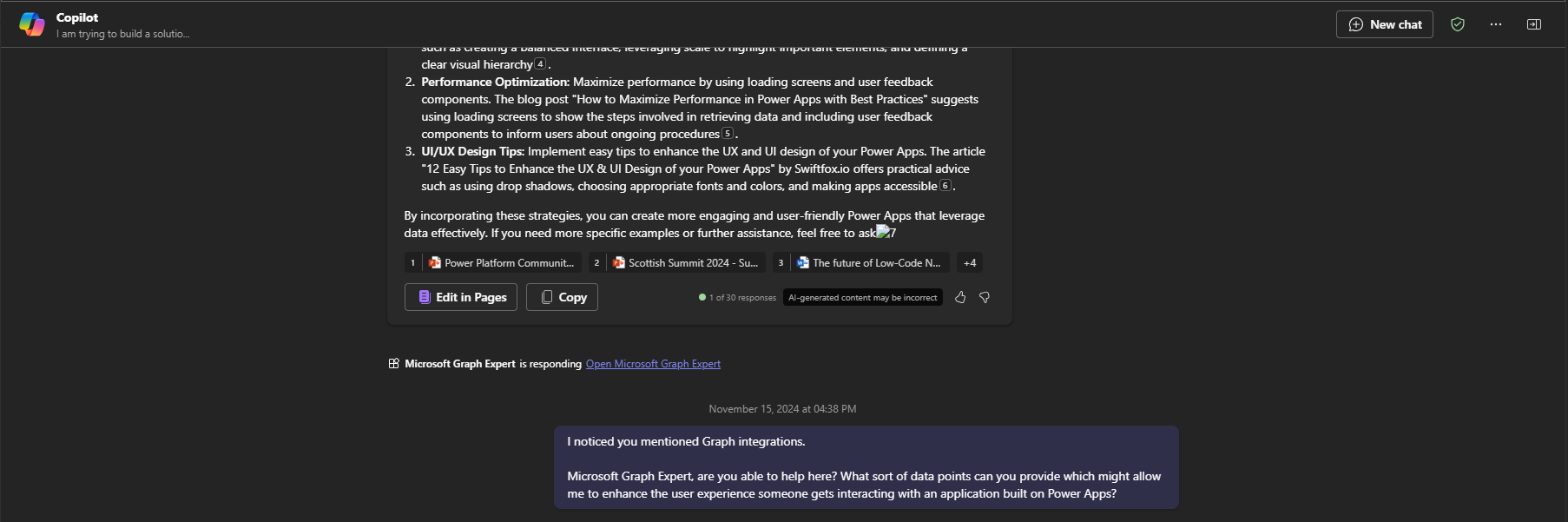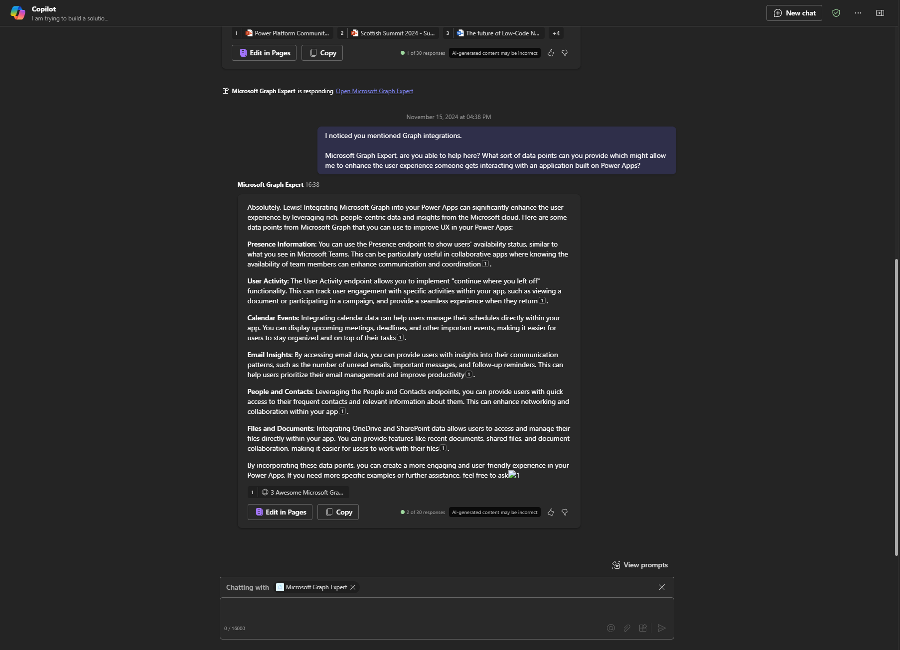 Okay so Copilot gives us a few ways in which we could enhance user experience. In fact I notice it pointed out Microsoft Graph. Now I suppose we could call on the Graph agent to confirm things and expand on how Graph can help improve our Power Apps...