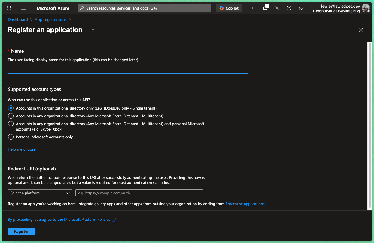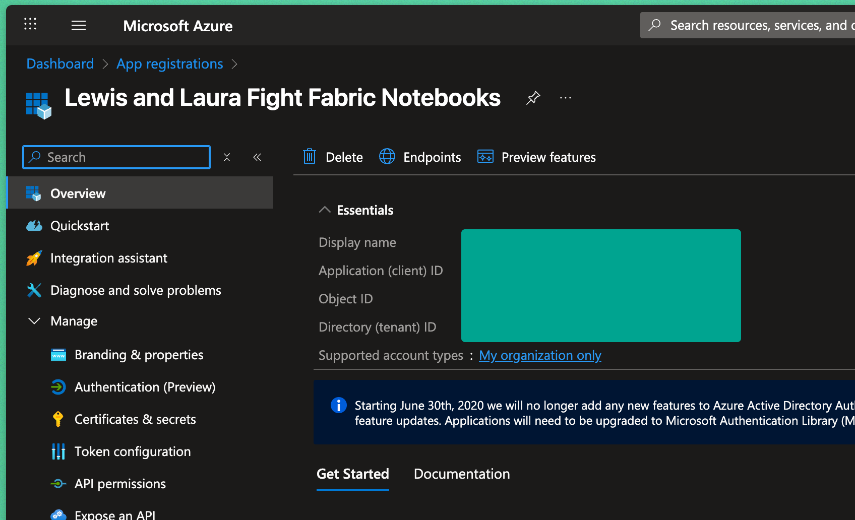 We're going to create an app registration in Microsoft Entra ID that we can use for authentication here. Laura will be able to then use this to give the notebook the ability to login or authenticate, using client credentials. Laura will use the client id, tenant id, and client secret to authenticate.