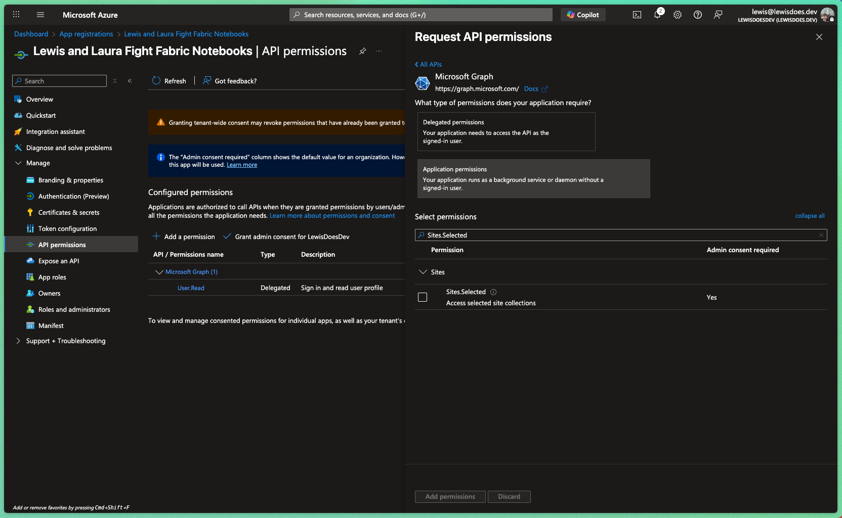 We handled authentication, but that doesn't mean our notebook will be able to access anything yet. Now we need to add the Sites.Selected application permission to our app registration, and we need to give admin consent for that permission.
