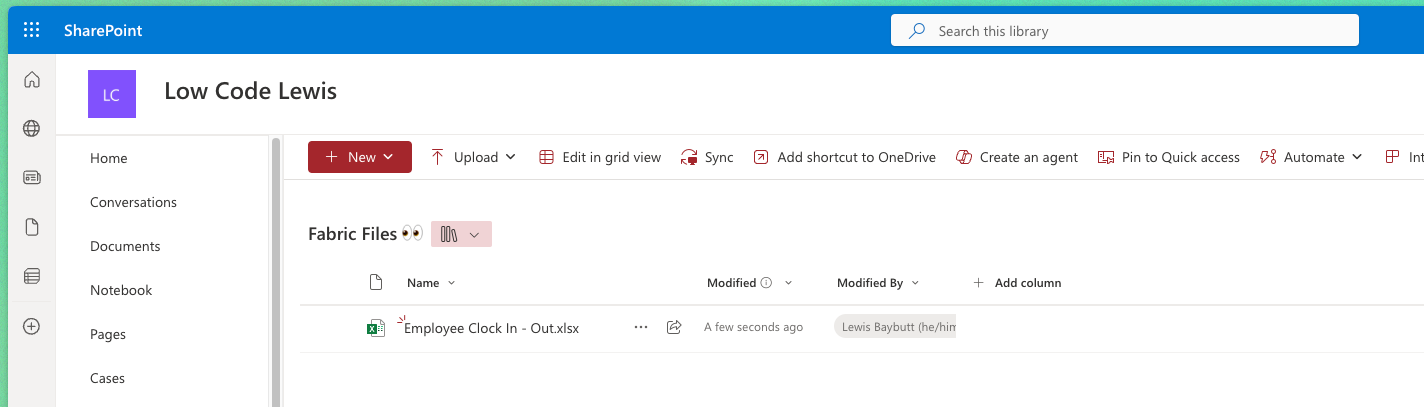 The first thing we need to do to achieve accessing Excel data from Python in a Fabric notebook, is to store that workbook in SharePoint. So very simply, I have an Excel workbook with a simple table in it, and I'm going to save that in a document library in a SharePoint site.
