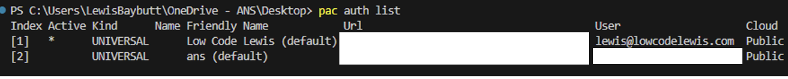 First we need to ensure we have authenticated properly to Power Platform from the CLI. There’s a number of things we can do here. First we can use pac auth list to list the auth profiles we have already created and that we can select from.