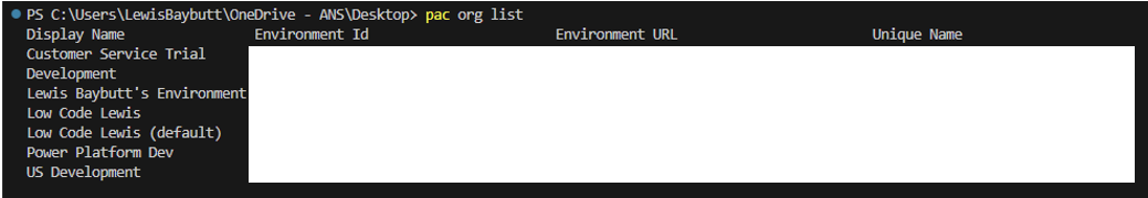 Next we will need to select the environment that we want to work with to export a solution from. To do this we will need to list our environments first to identify their names to then select the correct one. Start by running the following command to list environments.