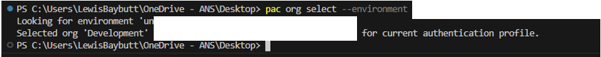 pac org select --environment EnvironmentNameReplace EnvironmentName with the name of the environment you’d like to work with.