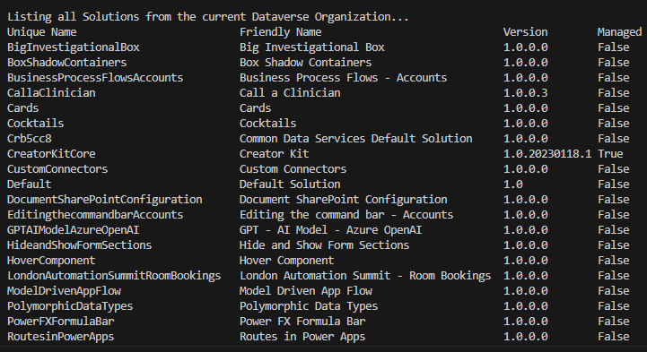 pac solution listThis will list all of the solutions from the currently selected Dataverse organisation / environment.