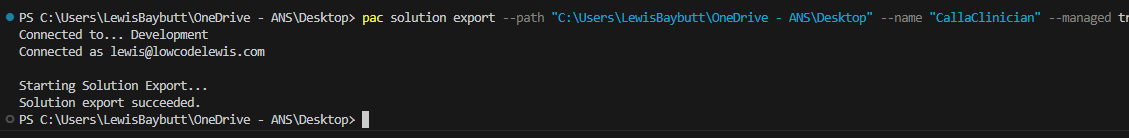 pac solution export --path c:\Users\Documents\Solution.zip --name MySolution --managed true Here you can see there are a number of parameters I have used for the export. The first two are required.