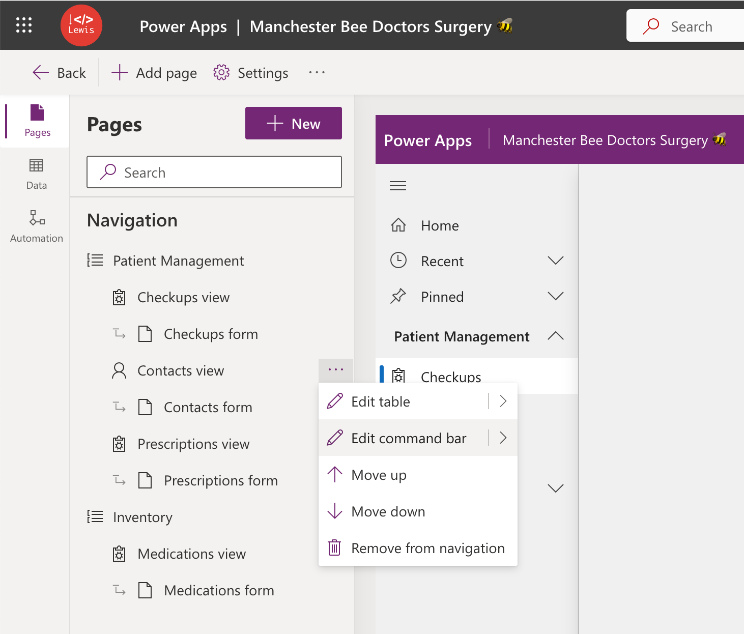 Now, the only thing left to do is to add a button to the ribbon in our app which will run our JavaScript function when it’s selected. Start by editing the model-driven app you’d like to apply this customisation to. In the left hand navigation find the table you want, select the three dots and select ‘Edit command bar’.