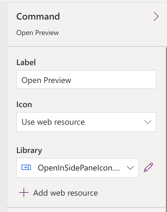 Now, add a command to your command bar and give it a label. I’m then using one of the out the box web resources for my button. You can pick one which works.