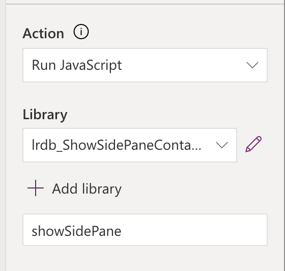 Now, for the action. Select the ‘Run JavaScript’ option. Then select your web resource which is the JavaScript library you uploaded to Dataverse. Finally populate the name of the function you want to execute which if you’ve used the same code as me is showSidePane.