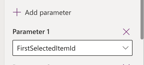 We’re almost done but we still need to pass some data into our JavaScript function which is our selected record GUID. Add a parameter and choose the FirstSelectedItemId out the box parameter.