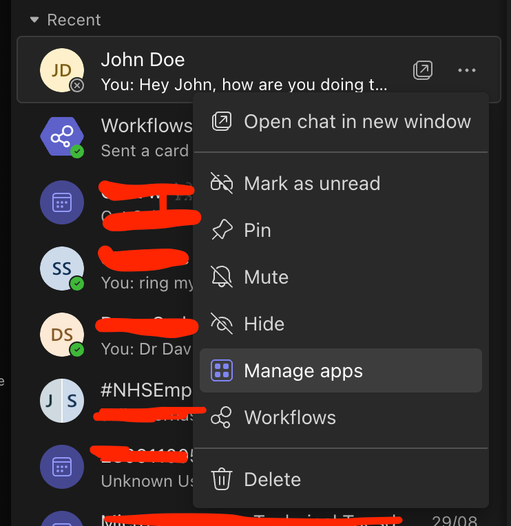 So to achieve this we need to configure a workflow in Microsoft Teams. These are powered by Power Automate! 🤩 To start configuring your workflow, select the three dots next to a chat with someone in Microsoft Teams and select ‘Workflows’.