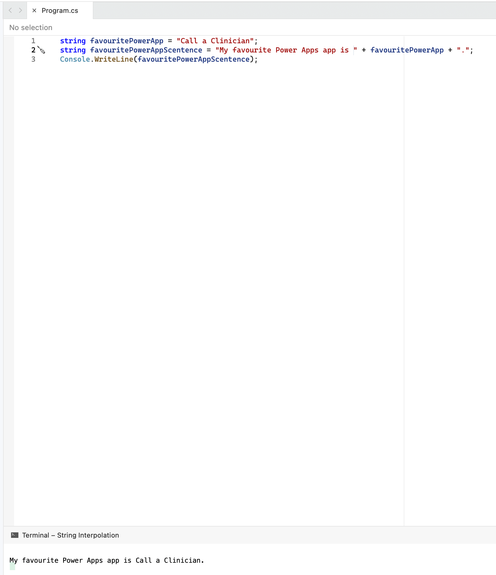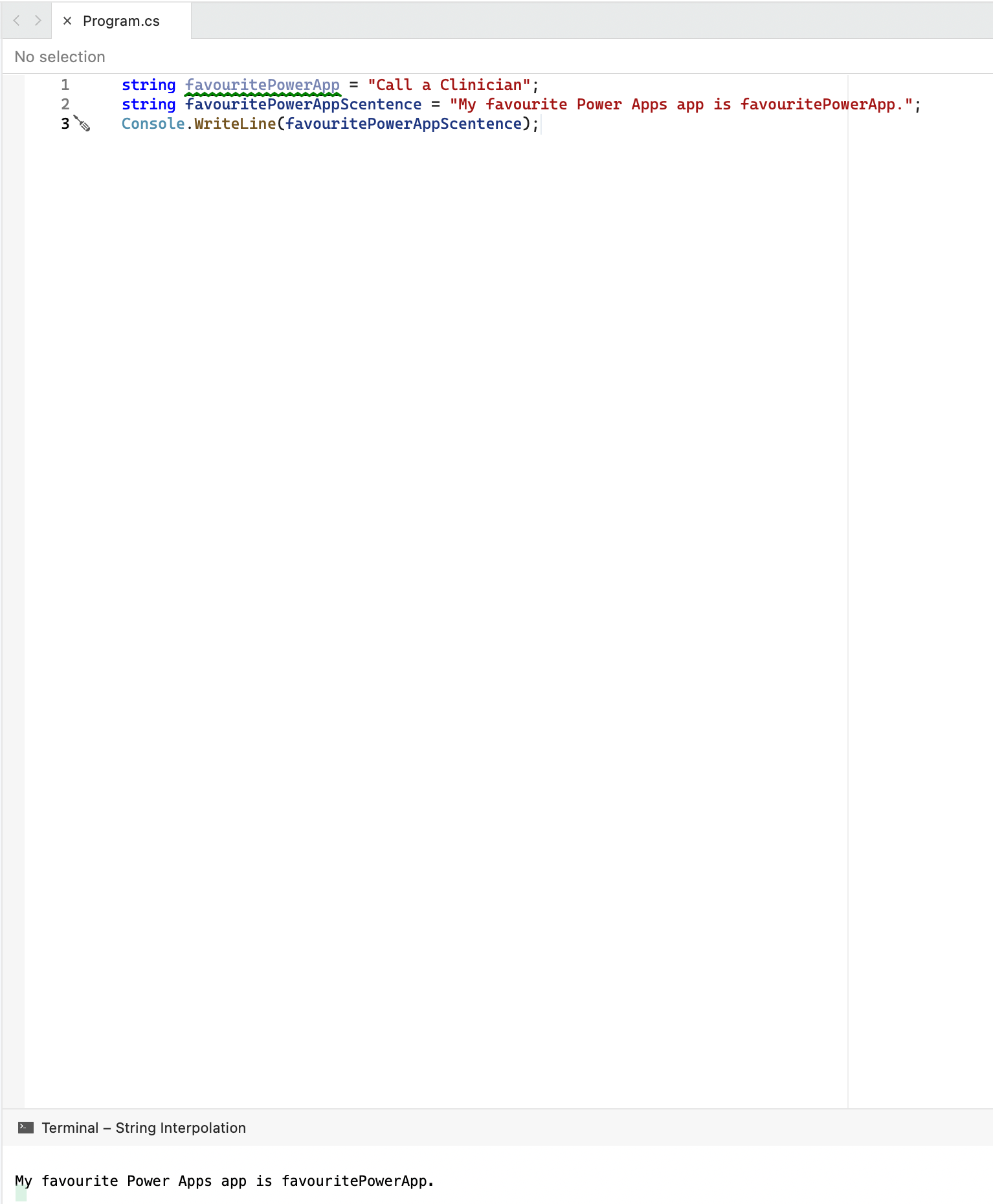string favouritePowerApp = "Call a Clinician"Here I’ve declared a variable called favouritePowerApp which is of type string and I’ve assigned the value Call a Clinician.