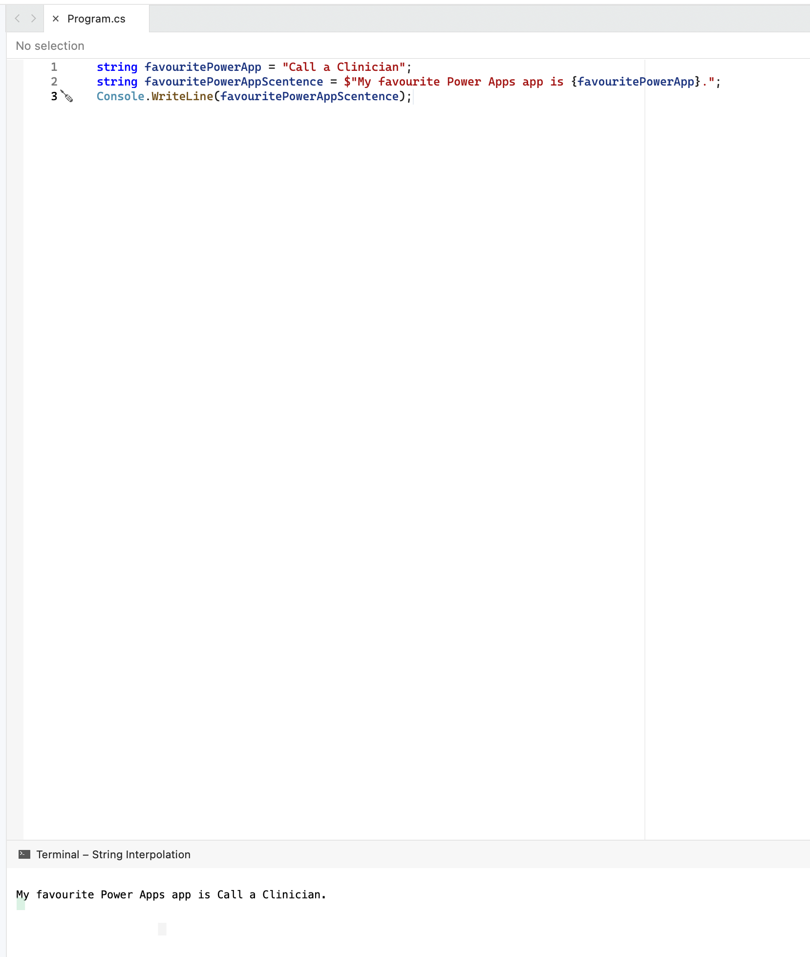 string favouritePowerAppScentence = $"My favourite Power Apps app is {favouritePowerApp}.";
