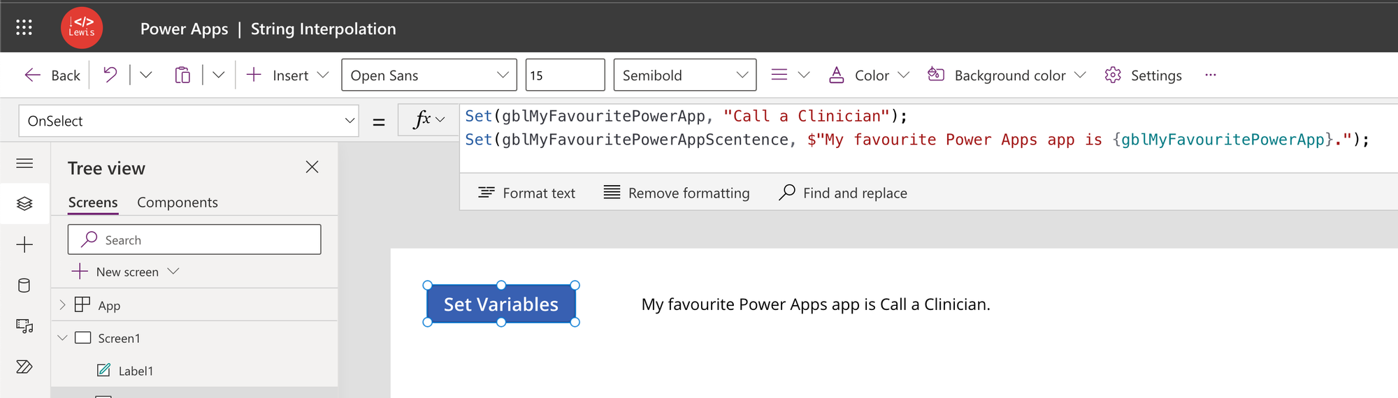 Set(gblMyFavouritePowerAppScentence, $"My favourite Power Apps app is {gblMyFavouritePowerApp}.");Now I have a text label on the screen next to my button which has the gblMyFavouritePowerAppScentence global variable in its Text property.