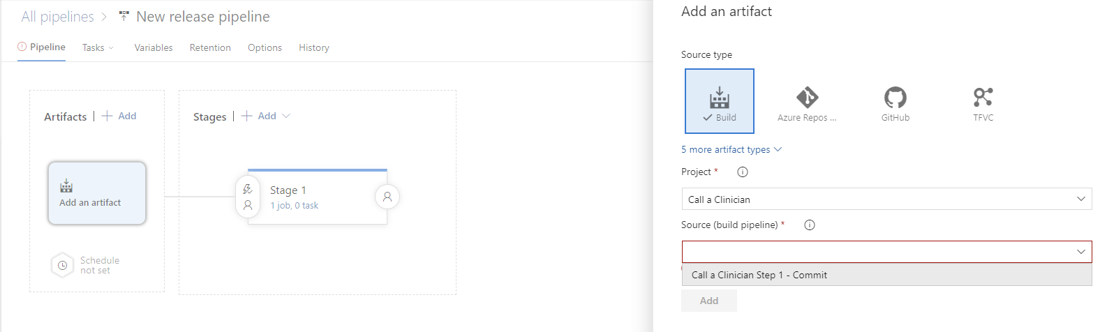 In the artifact, for the source field, select our build pipeline we’ve created.