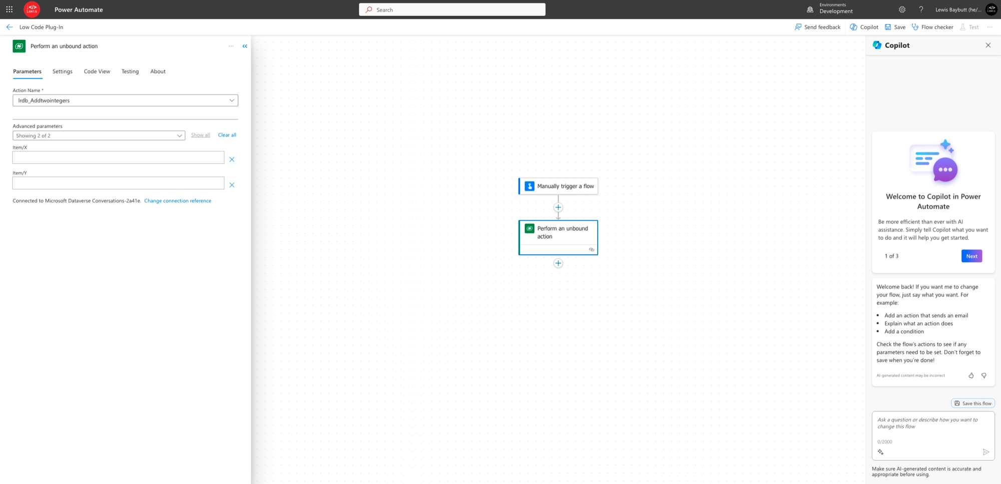 Now add a Dataverse action to the flow which can either be ‘Perform a bound action’ or ‘Perform an unbound action’. If unrelated to a table record, select ‘perform an unbound action’.