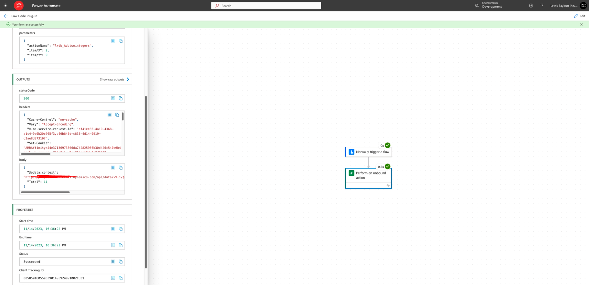 And there we go! My low-code plug-in can be called directly inside of a flow, I can pass in two integers, and as you can see inside the body of my response, I get my total back! Simples!